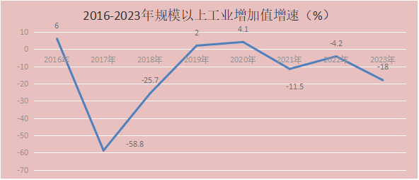2023年,全縣實(shí)現(xiàn)工業(yè)增加值同比下降13.2%;其中:我縣11家規(guī)模以上工業(yè)企業(yè)完成工業(yè)總產(chǎn)值同比下降22.4%,工業(yè)增加值同比下降18%,降幅比去年同期擴(kuò)大13.8個(gè)百分點(diǎn)。