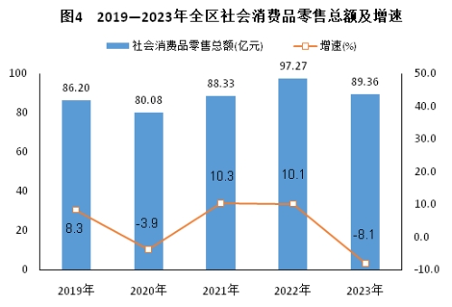 全年社會消費品零售總額89.36億元,同比下降8.1%。其中,限額以上商貿(mào)企業(yè)消費品零售額同比下降9.2%。