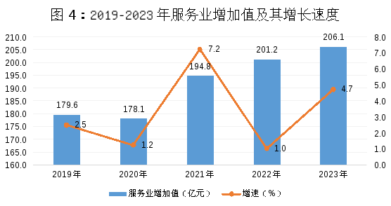全年批發(fā)和零售業(yè)增加值55.5億元,比上年下降2.3%;交通運(yùn)輸、倉儲(chǔ)及郵政業(yè)增加值14.4億元,增長(zhǎng)8.3%;住宿和餐飲業(yè)增加值6.3億元,增長(zhǎng)18.8%;金融業(yè)增加值24.8億元,增長(zhǎng)5.1%;房地產(chǎn)業(yè)增加值27.1億元,下降6.8%。全年規(guī)模以上服務(wù)業(yè)企業(yè)營(yíng)業(yè)收入比上年增長(zhǎng)7.3%。