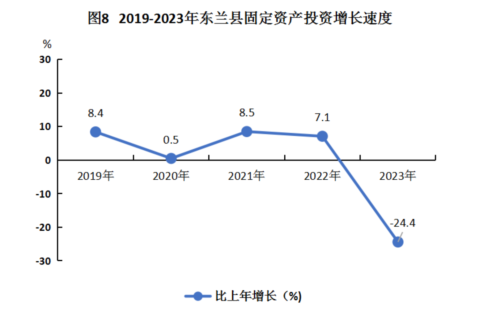 全年全縣固定資產(chǎn)投資(不含農(nóng)戶)比上年下降24.4%。其中,第一產(chǎn)業(yè)投資下降31.1%;第二產(chǎn)業(yè)投資增長57.0%,其中工業(yè)投資增長52.8%;第三產(chǎn)業(yè)投資下降37.0%?;A設施投資[8]下降19.6%。民間固定資產(chǎn)投資[9]增長6.8%。