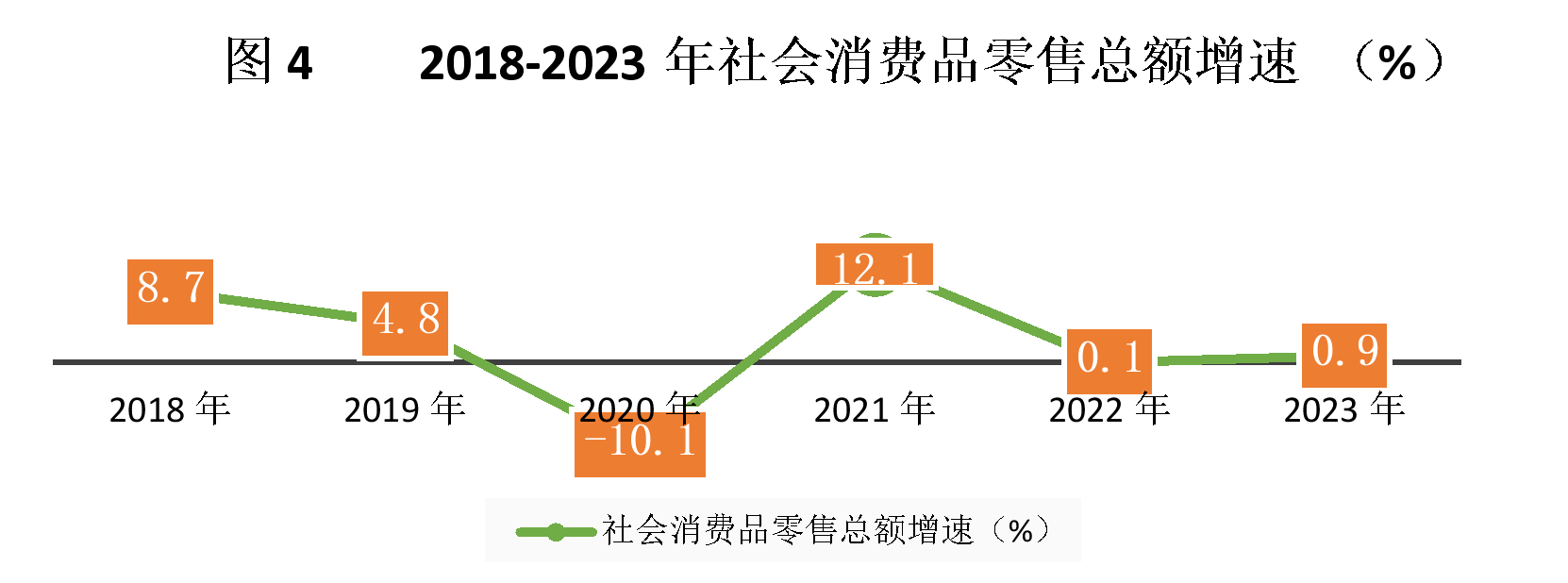 全年社會消費品零售總額比上年增長0.9%。按經營地統(tǒng)計,城鎮(zhèn)消費品零售額增長0.1%,鄉(xiāng)村消費品零售額增長4.1%。按消費類型統(tǒng)計,商品零售額下降0.8%,餐飲收入額增長14.2%。