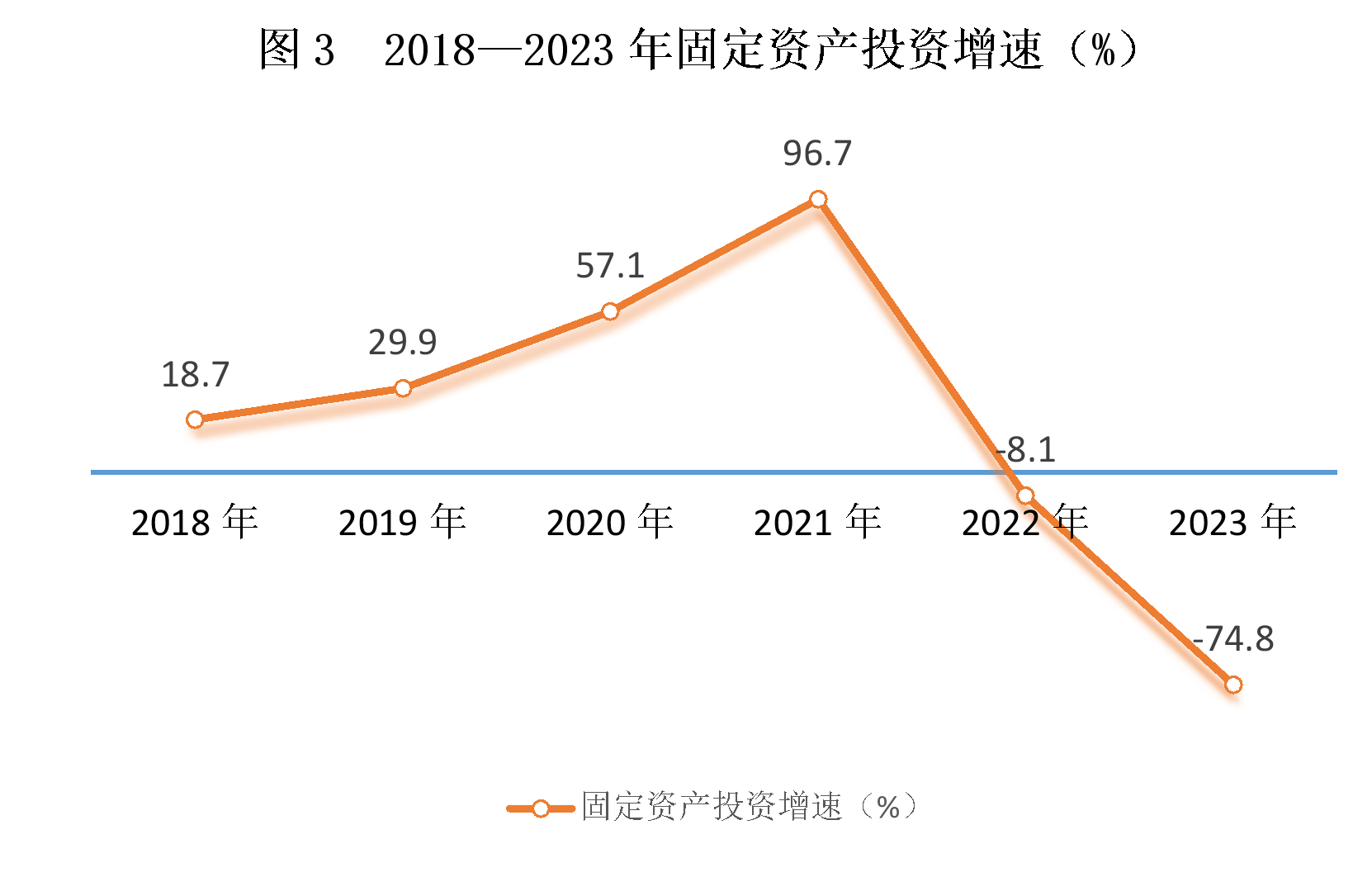 全年固定資產投資比上年下降74.8%。其中,第一產業(yè)投資下降29.6%;第二產業(yè)投資增長141.6%,工業(yè)投資增長126.8%;第三產業(yè)投資下降79.4%。民間固定資產投資下降35.7%,占固定資產投資(不含農戶)比重7.0%。