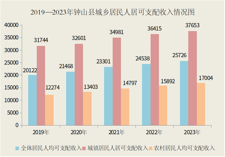 2023年全縣居民人均可支配收入25726元,名義增長(zhǎng)4.8%。城鎮(zhèn)居民人均可支配收入為37653元,名義增長(zhǎng)3.4%。農(nóng)村居民人均可支配收入17004元,名義增長(zhǎng)7.0%。