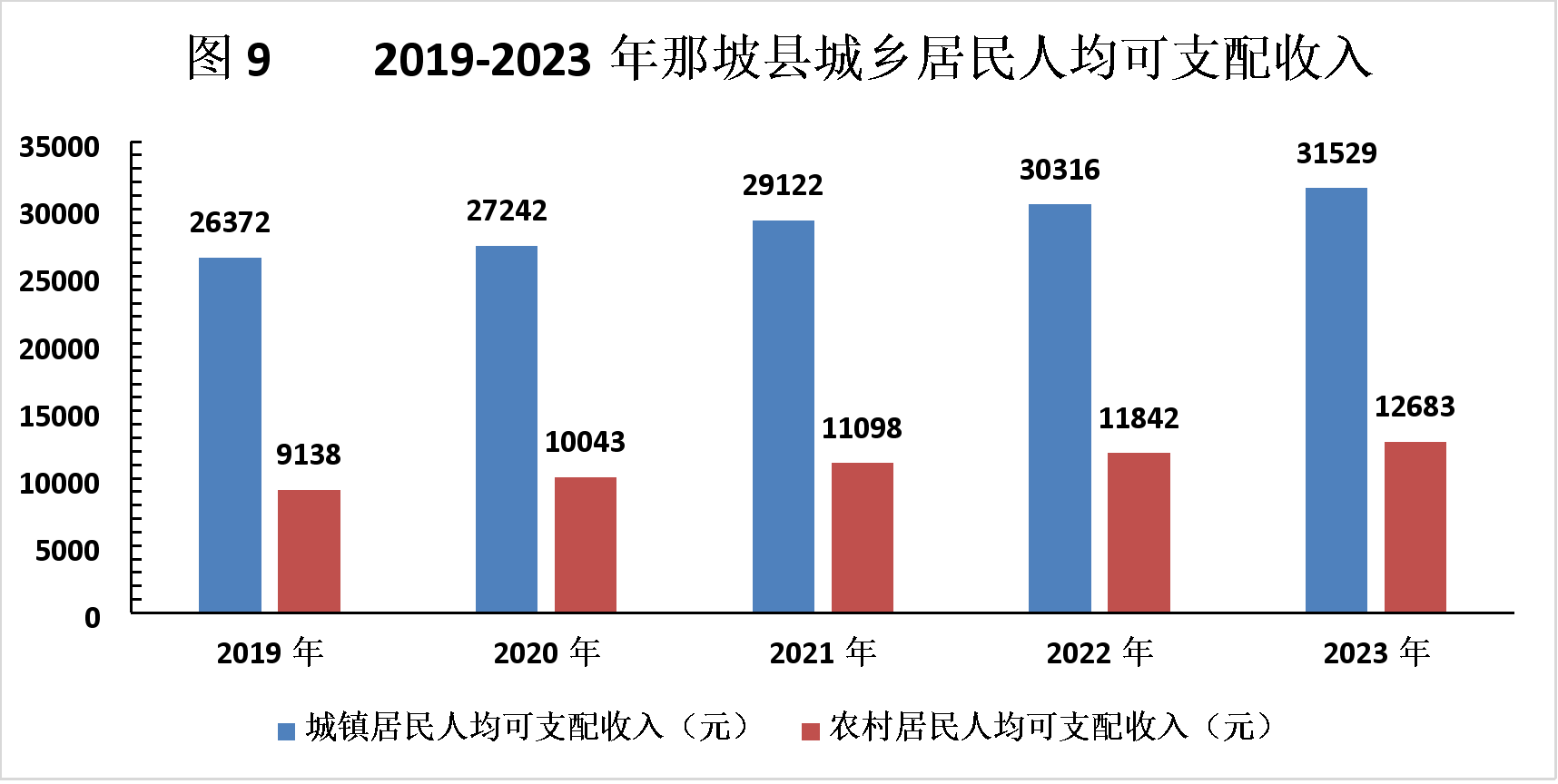 全年全縣居民人均可支配收入18001元,比上年名義增長5.9%。按常住地分,城鎮(zhèn)居民人均可支配收入31529元,比上年名義增長4.0 %。農(nóng)村居民人均可支配收入12683元,比上年名義增長7.1%。城鄉(xiāng)居民人均可支配收入比值為2.49:1,比上年縮小0.07。