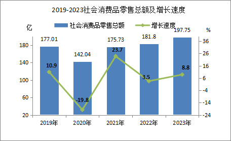2023年,全年實(shí)現(xiàn)社會(huì)消費(fèi)品零售總額197.75億元,比上年增長(zhǎng)8.8%。分地區(qū)看,城鎮(zhèn)消費(fèi)品零售額145.99億元,比上年增長(zhǎng)9.4%;農(nóng)村消費(fèi)品零售額51.76億元,比上年增長(zhǎng)6.9%。分行業(yè)看,批發(fā)零售業(yè)零售額153.46億元,比上年增長(zhǎng)8.5 %;住宿餐飲業(yè)零售額44.29億元,比上年增長(zhǎng)9.8%。