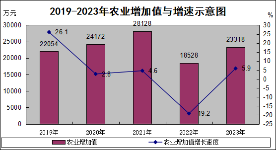 全年完成農(nóng)業(yè)總產(chǎn)值46202萬元,同比增長6.3%。實(shí)現(xiàn)農(nóng)業(yè)增加值23318萬元,同比增長5.9%。糧食總產(chǎn)量7507噸、增長137.9%。其中,夏糧產(chǎn)量55.8噸、下降20.9%,秋糧產(chǎn)量7453噸、增長143.3%。小麥產(chǎn)量54.4噸、下降21.9%,玉米產(chǎn)量7384噸、增長143.3%,馬鈴薯產(chǎn)量68噸、增長31.8%。食用菌產(chǎn)量348噸、增長25.9%,油料產(chǎn)量592噸、下降58.2%。
