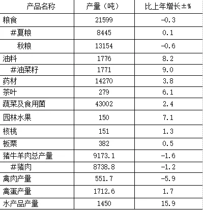 2023年,全縣農(nóng)林牧漁業(yè)增加值增長(zhǎng)4.3%。其中,農(nóng)業(yè)增加值增長(zhǎng)3.0%;林業(yè)增加值增長(zhǎng)7.9%;牧業(yè)增加值增長(zhǎng)4.1%;漁業(yè)增加值增長(zhǎng)16.9%;農(nóng)林牧漁專(zhuān)業(yè)及輔助性活動(dòng)增加值增長(zhǎng)6.5%。全年糧食種植面積10.49萬(wàn)畝,比上年下降0.9%;糧食產(chǎn)量2.16萬(wàn)噸,下降0.3%。油料種植面積1.56萬(wàn)畝,增長(zhǎng)8.1%;油料產(chǎn)量0.18萬(wàn)噸,增長(zhǎng)8.2%;蔬菜種植面積3.68萬(wàn)畝,增長(zhǎng)2.2%。