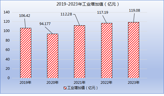 2023年,全縣工業(yè)增加值完成119.08億元,同比增長(zhǎng)8.1%,其中制造業(yè)增加值完成103.39億元,同比增長(zhǎng)7.5%,制造業(yè)增加值占地區(qū)生產(chǎn)總值比重46.2%。(見2019-2023年工業(yè)增加值柱狀圖、圖三)。