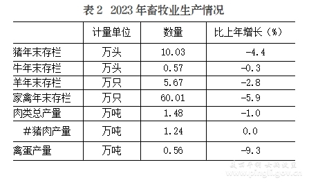 全縣豬、牛、羊出欄分別下降0.5%、0.6%、6.5%;禽蛋產(chǎn)量下降9.3%;豬牛羊禽肉產(chǎn)量下降1.0%。