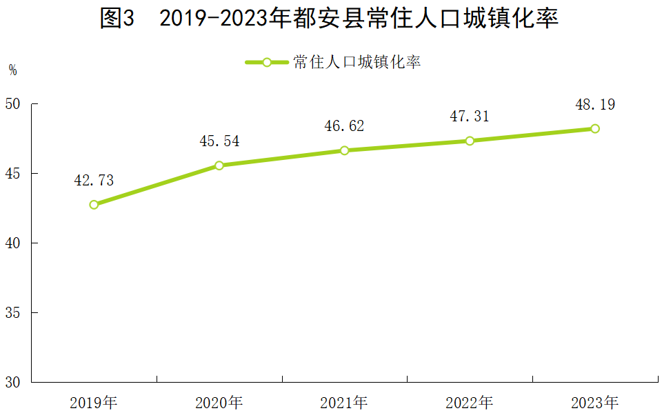 年末全縣常住人口[3]52.77萬人,比上年末減少0.79萬人,其中城鎮(zhèn)常住人口25.43萬人,占常住人口比重(常住人口城鎮(zhèn)化率[4])48.19%,比上年末提高0.88個百分點。全年出生人口0.53萬人,出生率為7.25‰;死亡人口0.44萬人,死亡率為6.03‰;自然增長率為1.23‰。