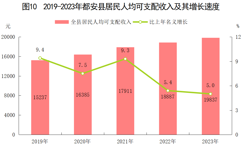 全年全縣居民人均可支配收入19837元,比上年名義(下同)增長5.0%。按常住地分,城鎮(zhèn)居民人均可支配收入30862元,比上年增長3.1%;農村居民人均可支配收入12672元,增長7.3%。城鄉(xiāng)居民人均收入比為2.44:1,比上年縮小0.09。