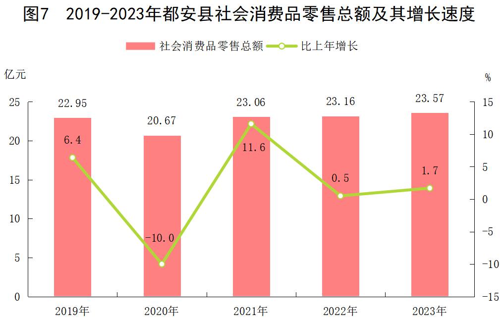 全年社會消費品零售總額[8]23.57億元,比上年增長1.7%。按經營地統(tǒng)計,城鎮(zhèn)消費品零售額增長0.3%,鄉(xiāng)村消費品零售額增長4.2%。按消費類型統(tǒng)計,餐飲收入增長19.7%,商品零售增長0.8%。