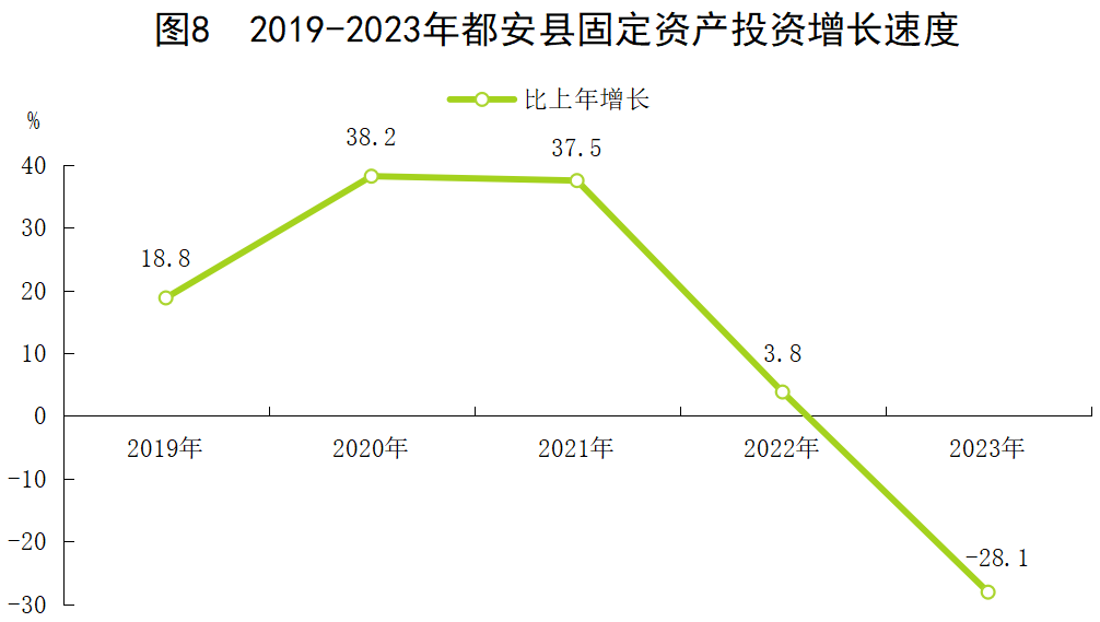 全年全縣固定資產投資(不含農戶)比上年下降28.1%。其中,第一產業(yè)投資下降19.4%;第二產業(yè)投資下降25.7%,其中工業(yè)投資下降25.7%;第三產業(yè)投資下降28.6%?;A設施投資[9]下降41.6%,民間固定資產投資[10]下降28.0%。