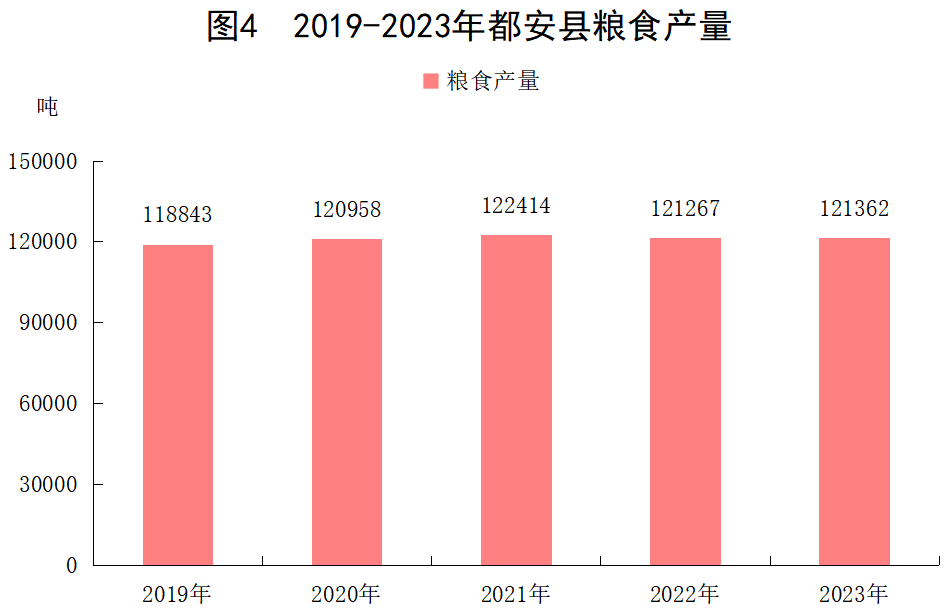 全年全縣糧食總產量121362噸,比上年增加95噸,比上年增長0.1%。其中,春收糧食產量111噸,下降33.1%;夏收糧食產量69888噸,下降1.3%;秋收糧食產量51364噸,增長2.1%。全年谷物產量108141噸,比上年下降0.8%。其中,稻谷產量33545噸,下降0.7%;早稻產量14901噸,下降0.4%;玉米產量74595噸,下降0.9%。