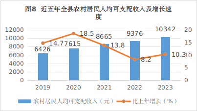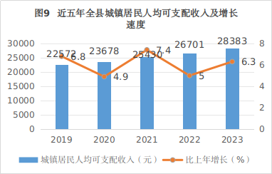 全年全縣居民人均可支配收入16771元,增長8.5%。其中,農村居民人均可支配收入10342元,增長10.3%;城鎮(zhèn)居民人均可支配收入28383元,增長6.3%。