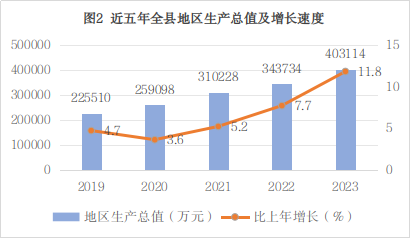初步核算,全年全縣地區(qū)生產總值403114萬元,同比增長11.8%。其中,第一產業(yè)增加值135882萬元,同比增長7.1%;第二產業(yè)增加值163628萬元,同比增長21.6%;第三產業(yè)增加值103604萬元,同比增長8.5%。三次產業(yè)結構為33.7:40.6:25.7。