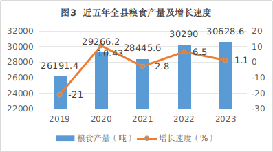 全年糧食產量30628.6噸,比上年增加1.1%。其中,夏糧產量36.1噸,增長106.3%;秋糧產量30592.5噸,增加1.1%。