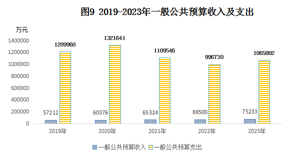 全年地方財(cái)政支出1385432萬(wàn)元,同比增長(zhǎng)25.4%;其中:一般公共預(yù)算支出1065802萬(wàn)元,同比增長(zhǎng)6.9%;一般公共服務(wù)支出100816萬(wàn)元,同比下降6.9%;教育支出407711萬(wàn)元,同比增長(zhǎng)23.8%;科學(xué)技術(shù)支出335萬(wàn)元,同比增長(zhǎng)84.1%;文化旅游體育與傳媒支出5899萬(wàn)元,同比增長(zhǎng)12.4%;社會(huì)保障和就業(yè)支出125709萬(wàn)元,同比增長(zhǎng)3.2%;衛(wèi)生健康支出66401萬(wàn)元,同比增長(zhǎng)12.8%;農(nóng)林水支出246506萬(wàn)元,同比增長(zhǎng)26.4%;環(huán)境保護(hù)支出13055萬(wàn)元,同比下降14.8%;城鄉(xiāng)社區(qū)支出3988萬(wàn)元,同比下降83.2%;政府性基金支出319625萬(wàn)元,同比增長(zhǎng)195.6%。