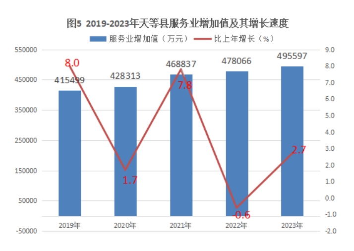 全年批發(fā)和零售業(yè)增加值5.68億元,比上年增長(zhǎng)5.5%;交通運(yùn)輸、倉(cāng)儲(chǔ)和郵政業(yè)增加值2.68億元,增長(zhǎng)6.2%;住宿和餐飲業(yè)增加值1.07億元,增長(zhǎng)8.1%;金融業(yè)增加值5.30億元,增長(zhǎng)9.2%;房地產(chǎn)業(yè)增加值10.53億元,下降3.4%;其他服務(wù)業(yè)增加值24.12億元,增長(zhǎng)2.9%。規(guī)模以上服務(wù)業(yè)企業(yè)營(yíng)業(yè)收入比上年增長(zhǎng)2.3%。