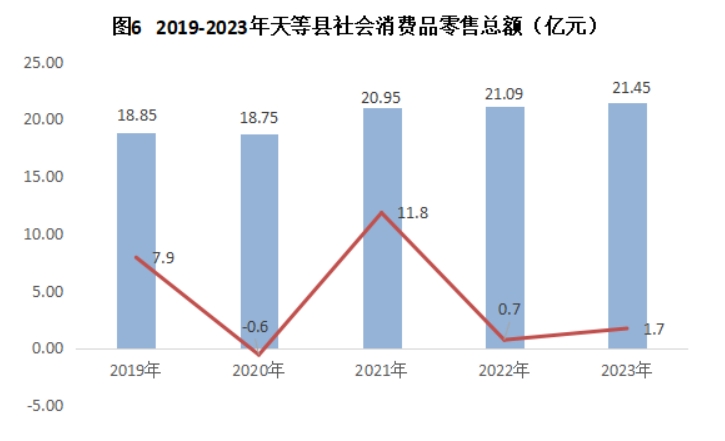 全年社會(huì)消費(fèi)品零售總額21.45億元,比上年增長(zhǎng)1.7%。按經(jīng)營(yíng)地統(tǒng)計(jì),城鎮(zhèn)消費(fèi)品零售額16.11億元,增長(zhǎng)1.8%;鄉(xiāng)村消費(fèi)品零售額5.34億元,增長(zhǎng)1.3%。按消費(fèi)類型統(tǒng)計(jì),商品零售額19.34億元,增長(zhǎng)1.2%;餐飲收入額2.11億元,增長(zhǎng)6.6%。