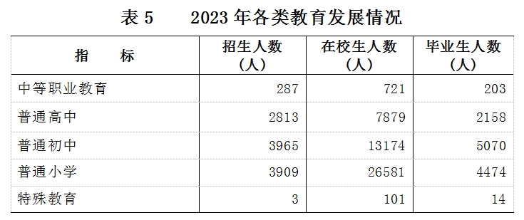 中等職業(yè)教育(不含技工)招生287人,在校生721人,畢業(yè)生203人。普通高中招生2813人,在校7879人,畢業(yè)生2158人。普通初中招生3965人,在校生13174人,畢業(yè)生5070人。普通小學(xué)招生3909人,在校生26581人,畢業(yè)生4474人。特殊教育招生3人,在校生101人,畢業(yè)生14人。學(xué)前教育在園幼兒8804人。九年義務(wù)教育鞏固率?97.8%,高中階段毛入學(xué)率94%。
