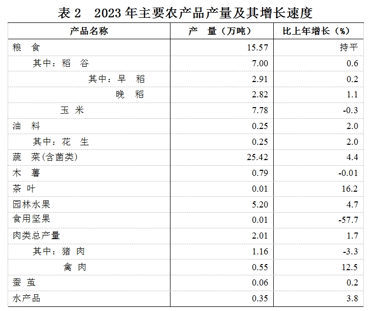 全年糧食總產(chǎn)量15.57萬(wàn)噸,與上年持平。其中,春收糧食產(chǎn)量396噸,增產(chǎn)5.9%;早稻產(chǎn)量2.91萬(wàn)噸,增產(chǎn)0.2%;秋糧產(chǎn)量7.40萬(wàn)噸,增產(chǎn)0.1%。全年谷物產(chǎn)量14.78萬(wàn)噸,增產(chǎn)0.13%。其中,稻谷產(chǎn)量7.0萬(wàn)噸,增產(chǎn)0.6%;玉米產(chǎn)量7.78萬(wàn)噸,減產(chǎn)0.3%。