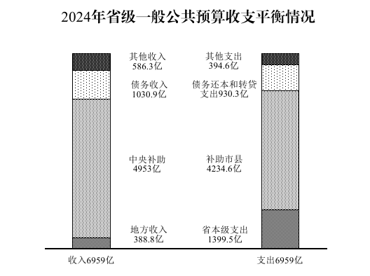 省級(jí)一般公共預(yù)算地方收入完成388.8億元,為預(yù)算的101%;加上中央補(bǔ)助4953億元,市縣上解274.4億元,一般債務(wù)收入1030.9億元,動(dòng)用預(yù)算穩(wěn)定調(diào)節(jié)基金60億元,調(diào)入資金等68.3億元,上年結(jié)轉(zhuǎn)183.6億元,收入合計(jì)6959億元。省本級(jí)一般公共預(yù)算支出1399.5億元,加上上解中央63.9億元,補(bǔ)助市縣4234.6億元,一般債務(wù)還本9億元,轉(zhuǎn)貸市縣一般債務(wù)921.9億元,補(bǔ)充預(yù)算穩(wěn)定調(diào)節(jié)基金90億元,調(diào)出資金48億元,結(jié)轉(zhuǎn)下年192.1億元,支出合計(jì)6959億元,收支平衡。
