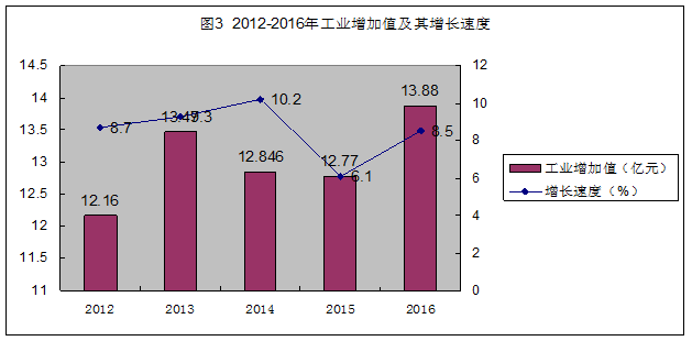 2016年全部工業(yè)增加值13.88億元,同比增長8.5%。其中規(guī)模以上工業(yè)增加值12.25億元,同比增長9.5%;規(guī)模以下工業(yè)增加值1.63億元,同比增長3.4%。全縣規(guī)模以上工業(yè)總產(chǎn)值32.5億元,同比增長11.9%。