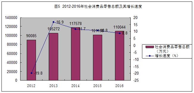 2016年全縣社會消費品零售總額為110043.9萬元,同比增長8.8%。其中限額以上完成38771.2萬元,同比增長24.24%;限額以下完成71272.7萬元,同比增長1.89%。分行業(yè)看,批發(fā)業(yè)銷售額65691.9萬元,比上年增長33.6%;零售業(yè)銷售額20578.7萬元,比上年增長18.6%;住宿業(yè)營業(yè)額4198.7萬元,比上年增長12.3%;餐飲業(yè)營業(yè)額27254.5萬元,比上年增長15.5%。