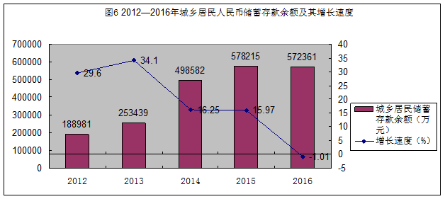 2016年年末,全縣金融機構各項存款額572361萬元,比上年下降1.01%。其中單位存款139354萬元,同比下降2.54%,個人存款433007萬元,同比增長20.11%。全縣金融機構各項貸款余額271058萬元,同比增長0.75%。