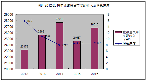 2016年,全縣居民人均可支配收入達15813元,同比增長9.0%,其中全縣農(nóng)村居民人均可支配收入達9658元,同比增長8.59%;全縣城鎮(zhèn)居民人均可支配收入達26813元,同比增長8.7%。