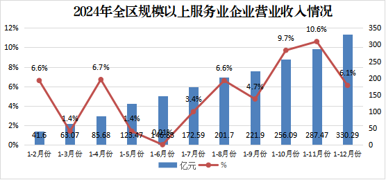 服務(wù)業(yè)加速轉(zhuǎn)型升級(jí)。全區(qū)服務(wù)業(yè)實(shí)現(xiàn)增加值505.76億元,比上年增長(zhǎng)5.9%,拉動(dòng)GDP增長(zhǎng)4.4個(gè)百分點(diǎn)。全區(qū)規(guī)模以上服務(wù)業(yè)企業(yè)實(shí)現(xiàn)營(yíng)業(yè)收入330.29億元,增長(zhǎng)6.1%。分行業(yè)來(lái)看:交通運(yùn)輸、倉(cāng)儲(chǔ)和郵政業(yè)實(shí)現(xiàn)營(yíng)業(yè)收入139.26億元,增長(zhǎng)3.4%;租賃和商務(wù)服務(wù)業(yè)實(shí)現(xiàn)營(yíng)業(yè)收入73.54億元,增長(zhǎng)39.4%;信息傳輸、軟件和信息技術(shù)服務(wù)業(yè)實(shí)現(xiàn)營(yíng)業(yè)收入51.9億元,下降1.2%;水利、環(huán)境和公共設(shè)施管理業(yè)實(shí)現(xiàn)營(yíng)業(yè)收入41.67億元,下降13.4%;房地產(chǎn)業(yè)實(shí)現(xiàn)營(yíng)業(yè)收入8.83億元,下降4.6%;科學(xué)研究和技術(shù)服務(wù)業(yè)實(shí)現(xiàn)營(yíng)業(yè)收入8.99億元,增長(zhǎng)14.3%;衛(wèi)生和社會(huì)工作實(shí)現(xiàn)營(yíng)業(yè)收入2.13億元,增長(zhǎng)6.3%;文化、體育和娛樂(lè)業(yè)實(shí)現(xiàn)營(yíng)業(yè)收入3.01億元,下降7.9%;居民服務(wù)、修理和其他服務(wù)業(yè)實(shí)現(xiàn)營(yíng)業(yè)收入0.97億元,增長(zhǎng)22.7%。
