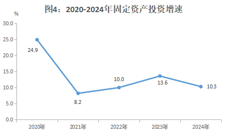 2024年,固定資產(chǎn)投資完成額比上年增長(zhǎng)10.3%,其中民間投資下降48.4%。分產(chǎn)業(yè)看,一產(chǎn)業(yè)投資增長(zhǎng)129.2%;二產(chǎn)業(yè)投資下降0.1%,其中工業(yè)投資下降0.3%、技改投資下降19.4%;三產(chǎn)業(yè)投資下降5.1%。房地產(chǎn)投資下降71.5%。