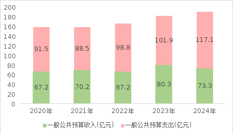 ????2024年,全區(qū)一般公共預(yù)算收入73.3 億元,比上年下降8.7%。區(qū)級稅收收入55.7億元,下降6.9%。其中,增值稅、企業(yè)所得稅、個人所得稅分別為19.1億元、9.4億元、3.0億元,分別占稅收比重34.3%、16.8%、5.5%。一般公共預(yù)算支出117.1億元,增長14.9%。