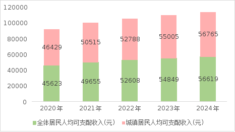 圖4 ?2020年—2024年全體居民、城鎮(zhèn)居民人均可支配收入