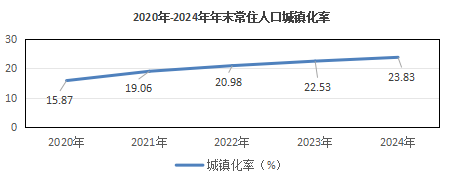 2024年年末全縣常住人口31.47萬人,比上年末減少0.19萬人。其中,城鎮(zhèn)人口7.5萬人,比上年末增加0.37萬人;鄉(xiāng)村人口23.97萬人,比上年末減少0.56萬人。城鎮(zhèn)人口占全縣常住人口的比重(城鎮(zhèn)化率)為23.83%,比上年末提高1.3個(gè)百分點(diǎn)。