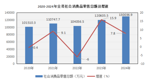 全縣實(shí)現(xiàn)社會(huì)消費(fèi)品零售總額13億元,比上年增長(zhǎng)7.8%,其中:限上完成1.56億元,比上年增長(zhǎng)28.5%;限下完成11.44億元,比上年增長(zhǎng)5.5%。按經(jīng)營(yíng)單位所在地分,城鎮(zhèn)消費(fèi)品零售額9.5億元、同比增長(zhǎng)4.6%,鄉(xiāng)村消費(fèi)品零售額3.5億元、同比增長(zhǎng)17.8%;按消費(fèi)形態(tài)分,餐費(fèi)收入1.7億元、同比增長(zhǎng)17.4%,商品零售11.3萬元、同比增長(zhǎng)6.5%。