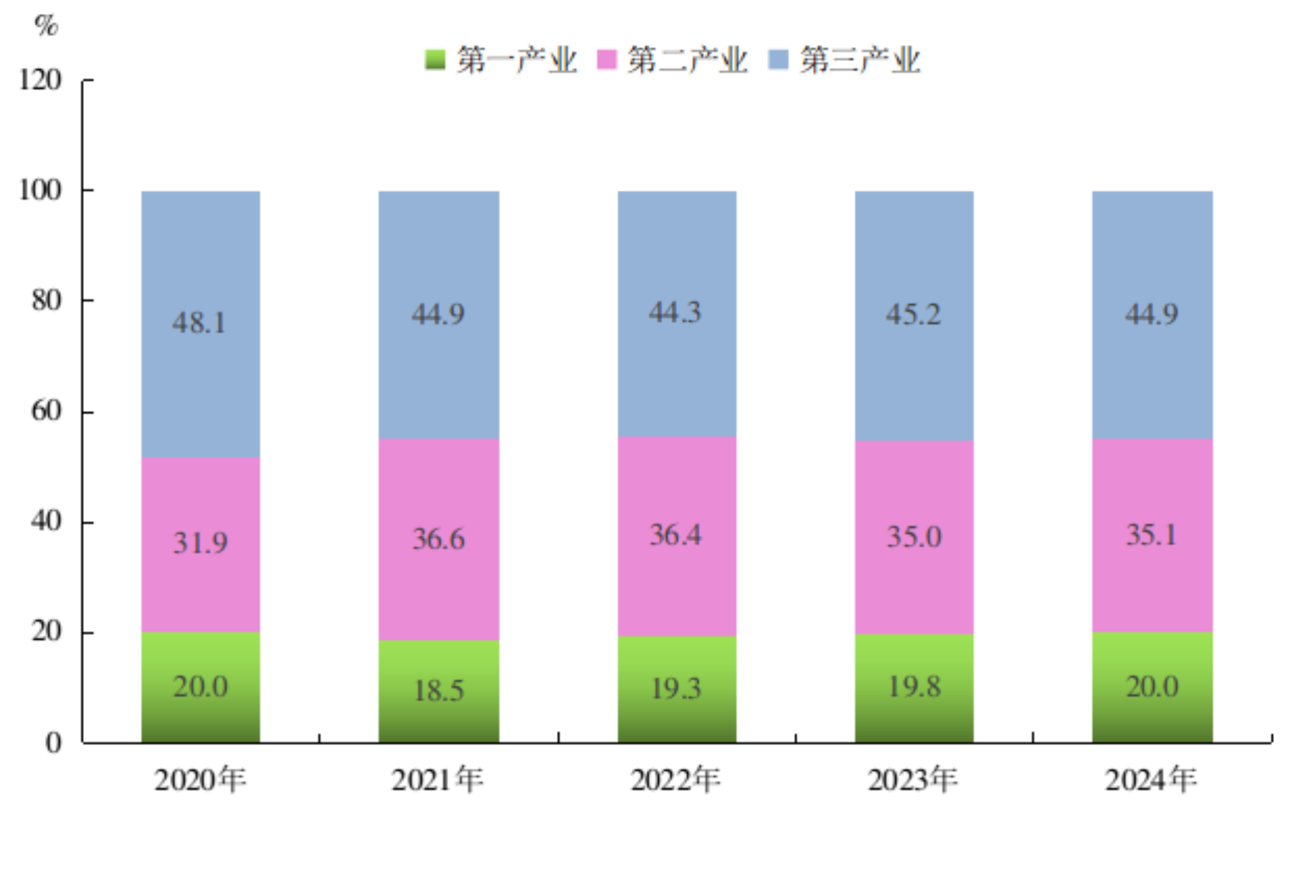 圖2??2020-2024年賀州市三次產(chǎn)業(yè)增加值占GDP比重