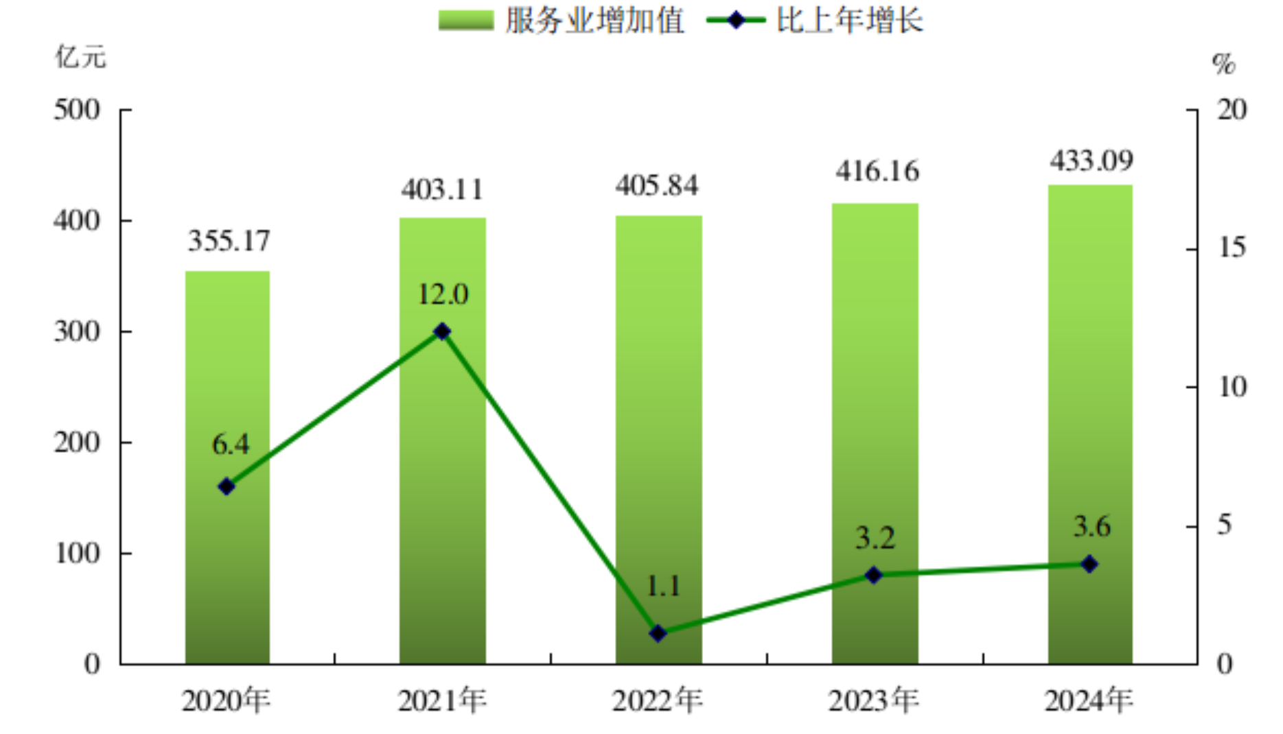 圖7??2020-2024年賀州市服務(wù)業(yè)增加值及其增長(zhǎng)速度