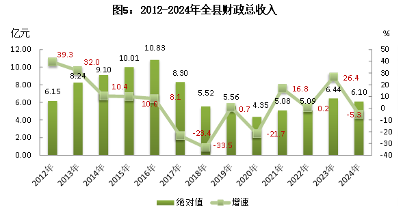 2024年,全縣財(cái)政總收入60988萬元,同比下降5.3%,其中:一般公共預(yù)算收入37644萬元,同比增長(zhǎng)5.3%。財(cái)政總支出294523萬元,同比下降12.8%,其中:財(cái)政一般預(yù)算支出236621萬元,同比增長(zhǎng)20.5%。一般預(yù)算支出中,一般公共服務(wù)39091萬元,同比增長(zhǎng)0.3%,教育支出42089萬元,同比增長(zhǎng)0.8%,社會(huì)保障與就業(yè)支出34067萬元,同比增長(zhǎng)25.7%,醫(yī)療衛(wèi)生支出18186萬元,同比下降31.0%,農(nóng)林水事務(wù)支出47318萬元,同比增長(zhǎng)67.5%。