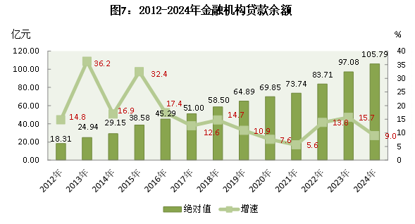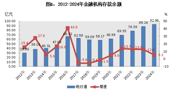 2024年末,金融機(jī)構(gòu)存款余額929764萬元,同比增長(zhǎng)5.3%;金融機(jī)構(gòu)貸款余額1057944萬元,同比增長(zhǎng)9.0%。