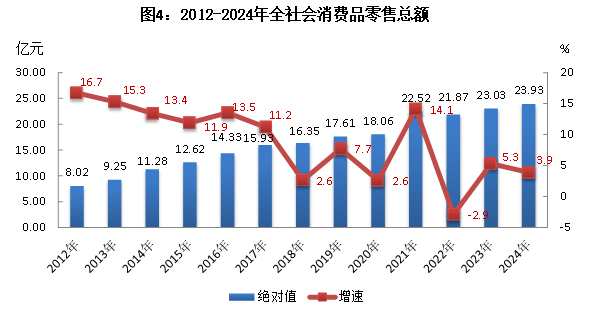 2024年全社會(huì)消費(fèi)品零售總額239302.6萬元,同比增長(zhǎng)3.9%。批發(fā)業(yè)銷售額146575.4萬元,同比增長(zhǎng)7.2%;零售業(yè)銷售額186342.9萬元,同比增長(zhǎng)5.9%;住宿業(yè)營業(yè)額34503.2萬元,同比增長(zhǎng)6.4%;餐飲業(yè)營業(yè)額50973.3萬元,同比增長(zhǎng)9.1%。