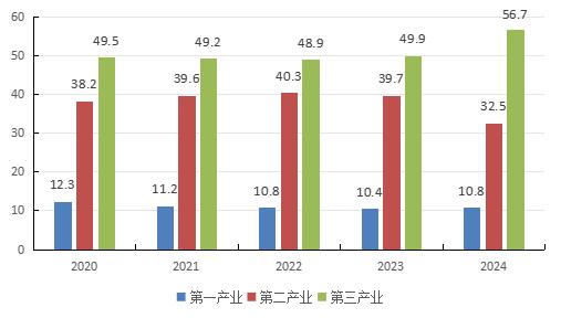圖二???2020-2024年三次產(chǎn)業(yè)增加值占地區(qū)生產(chǎn)總值比重