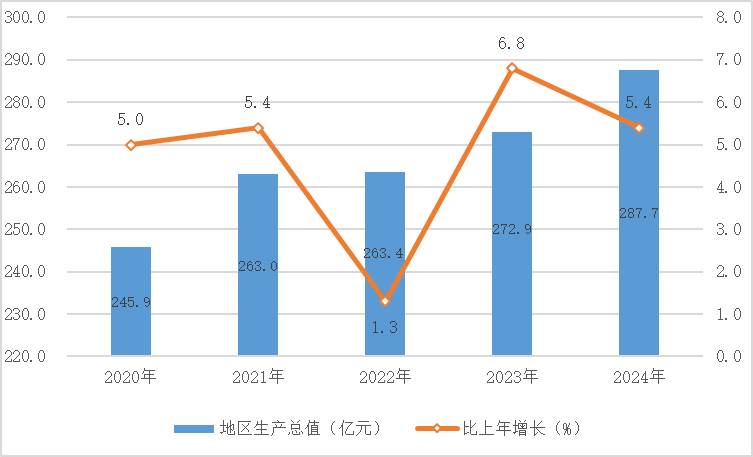 圖1 2020-2024年儀隴縣地區(qū)生產(chǎn)總值總量及增速