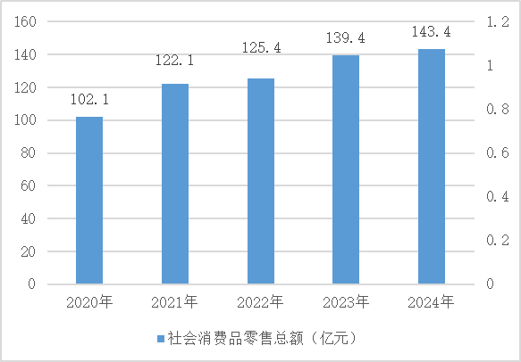全年實(shí)現(xiàn)社會(huì)消費(fèi)品零售總額143.4億元,比上年增長(zhǎng)2.8%。其中,限額以上企業(yè)(單位)消費(fèi)品零售總額28.2億元,增長(zhǎng)22.2%。按經(jīng)營(yíng)地分,城鎮(zhèn)消費(fèi)品零售額101.7億元,比上年增長(zhǎng)3.0%;鄉(xiāng)村消費(fèi)品零售額41.7億元,增長(zhǎng)2.5%。按消費(fèi)類型分,商品零售額113.9億元,增長(zhǎng)3.0%;餐飲收入29.4億元,增長(zhǎng)2.2%。