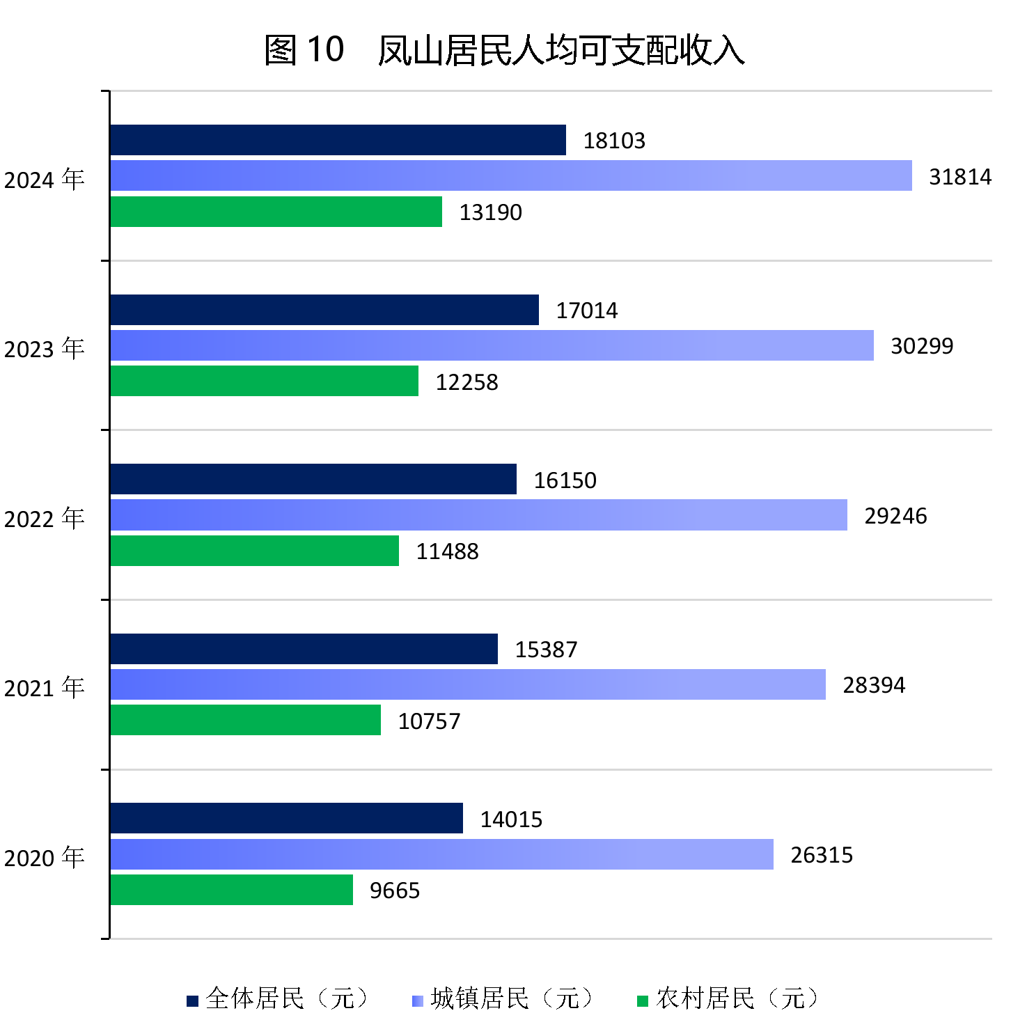 2024年,全體居民人均可支配收入18103元,比上年增長6.4%。按常住地分,城鎮(zhèn)居民人均可支配收入31814元,增長5.0%;農(nóng)村居民人均可支配收入13190元,增長7.6%。