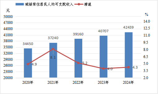 圖11??2020-2024年城鎮(zhèn)常住居民人均可支配收入及其增長速度