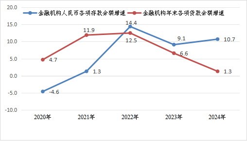 圖10??2020-2024年金融機構(gòu)人民幣各項存貸款余額增長速度