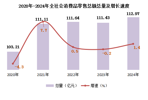 社會消費品零售額1129709萬元,比上年增長1.4%,其中:城鎮(zhèn)消費品零售額903769萬元,比上年增長1.2%;鄉(xiāng)村消費品零售額225940萬元,比上年增長1.9%。
