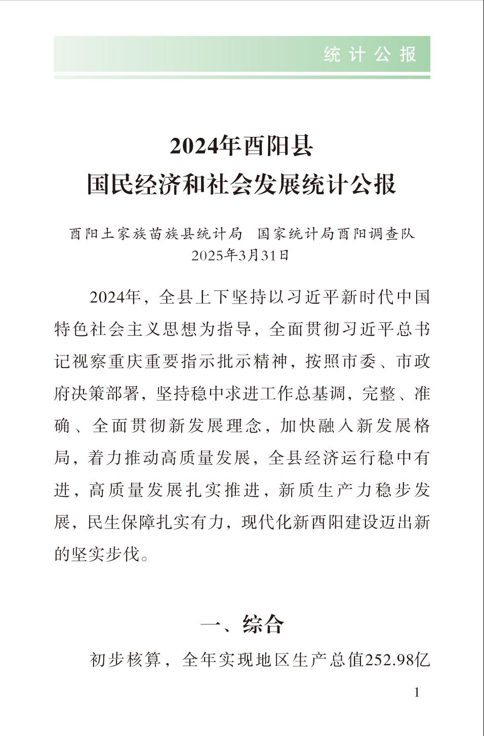 2024年重慶市酉陽土家族苗族自治縣人民政府國民經(jīng)濟(jì)和社會(huì)發(fā)展統(tǒng)計(jì)公報(bào)(2025年更新)